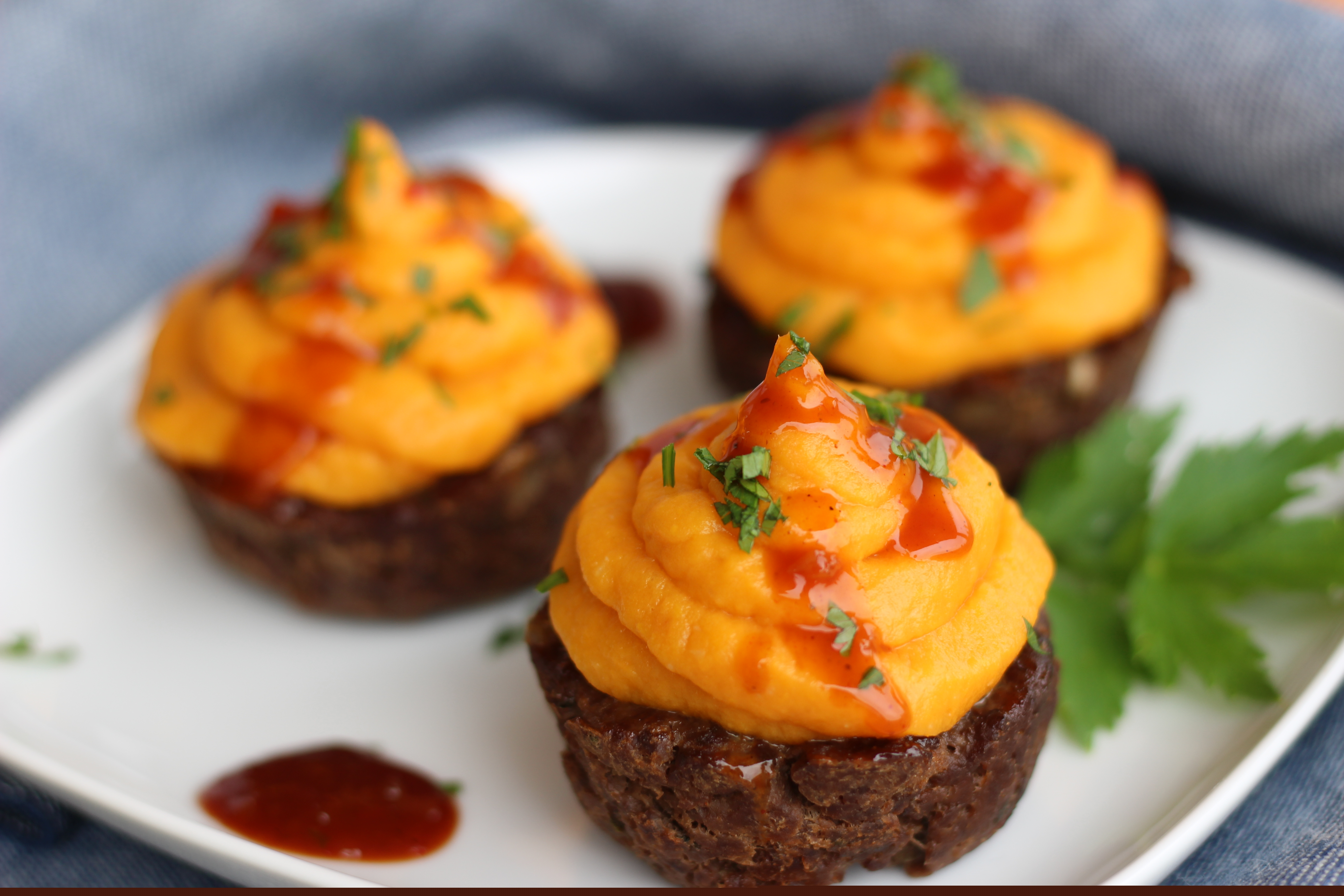 Zemiakové pyré vložíme do zdobiaceho sáčku a na vrch každej mäsovej muffinky urobíme čiapočku, ktorú ešte polejeme grilovacou omáčkou a posypeme čerstvou petržlenkou.